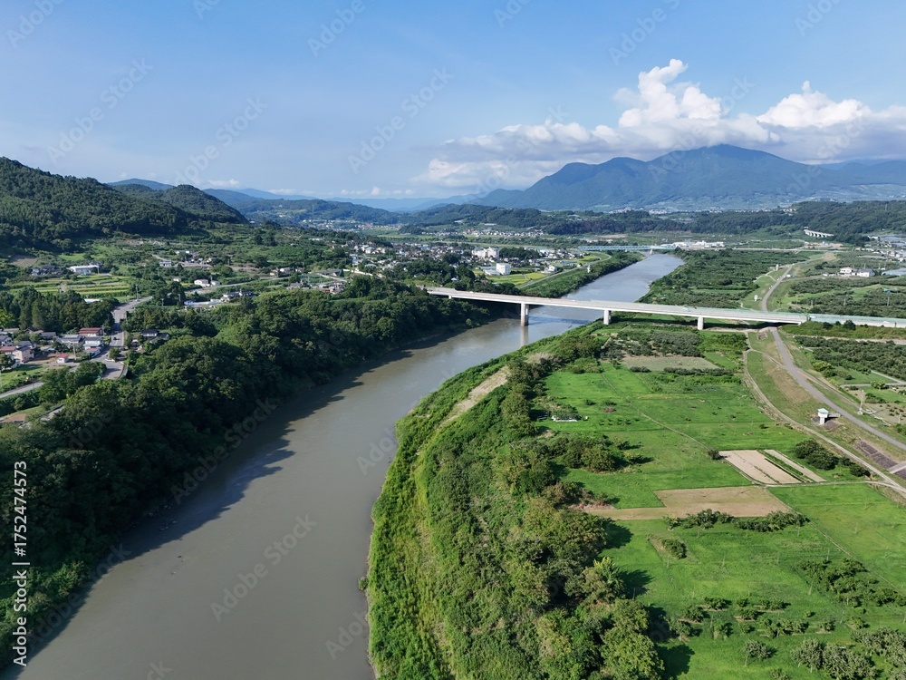 A river runs through a lush green valley with a bridge spanning across it. The bridge is surrounded by trees and the valley is dotted with small houses. The scene is peaceful and serene