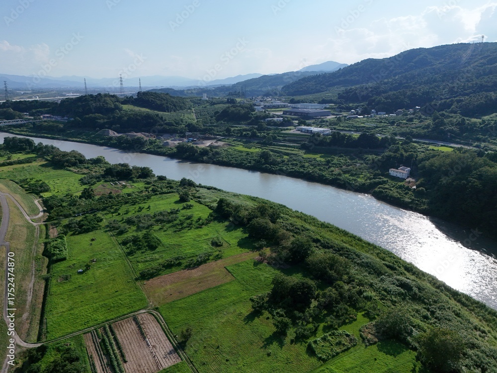 A river runs through a lush green valley with a town in the distance. The sky is clear and the sun is shining, creating a peaceful and serene atmosphere