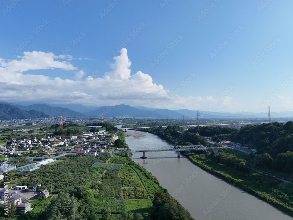 A river runs through a town with a bridge over it. The sky is clear and the sun is shining