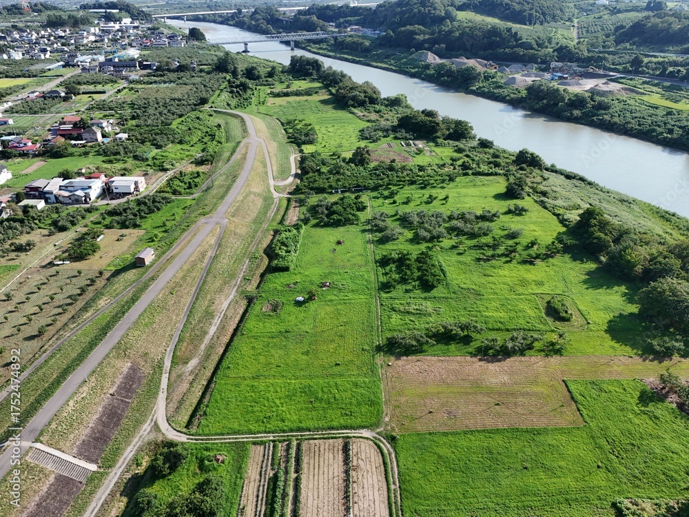 A green field with a river running through it. The river is surrounded by trees and the field is full of grass