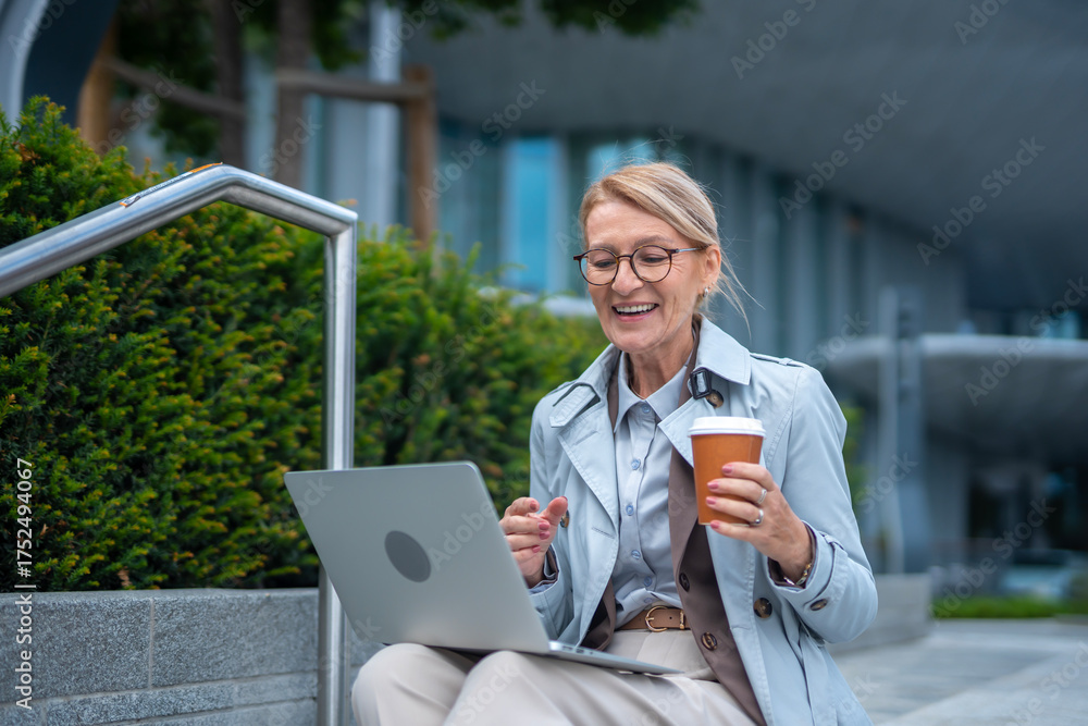 Shot smiling senior businesswoman. Laptop, hot drink and happy woman at outdoor for remote work, networking or professional communication. Computer and creative freelancer outside for online project.