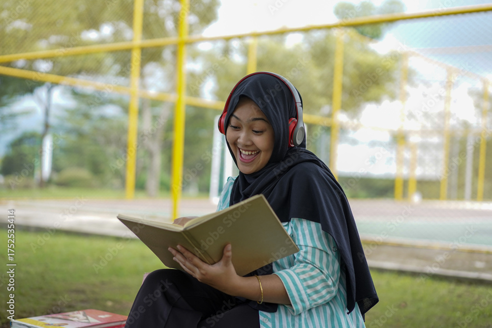 Serene young woman in a hijab and red headphones, deeply engrossed in reading a book while studying outdoors on a tranquil park bench, fostering knowledge and personal growth