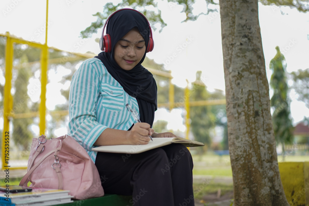 Serene young woman in a hijab and red headphones, deeply engrossed in reading a book while studying outdoors on a tranquil park bench, fostering knowledge and personal growth