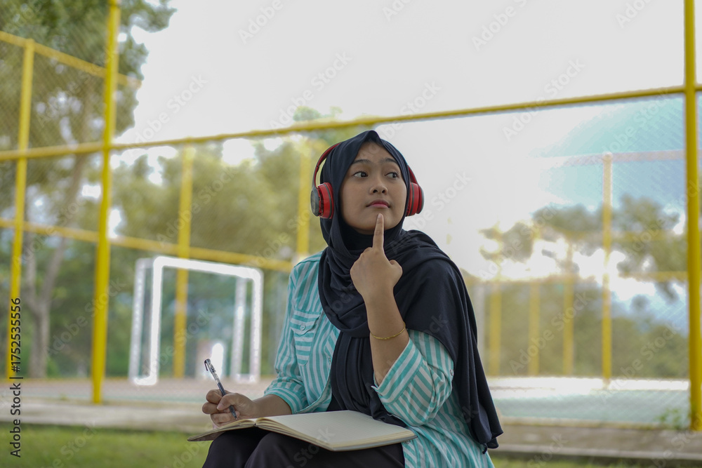 Serene young woman in a hijab and red headphones, deeply engrossed in reading a book while studying outdoors on a tranquil park bench, fostering knowledge and personal growth