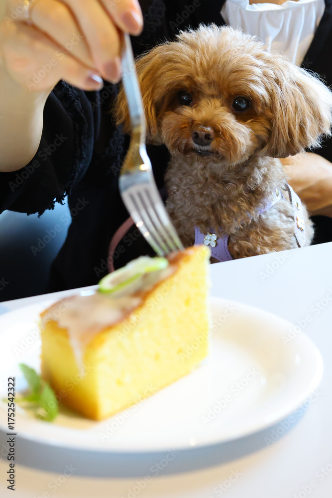 ヒト用のケーキを羨ましそうに見つめるトイ・プードル
