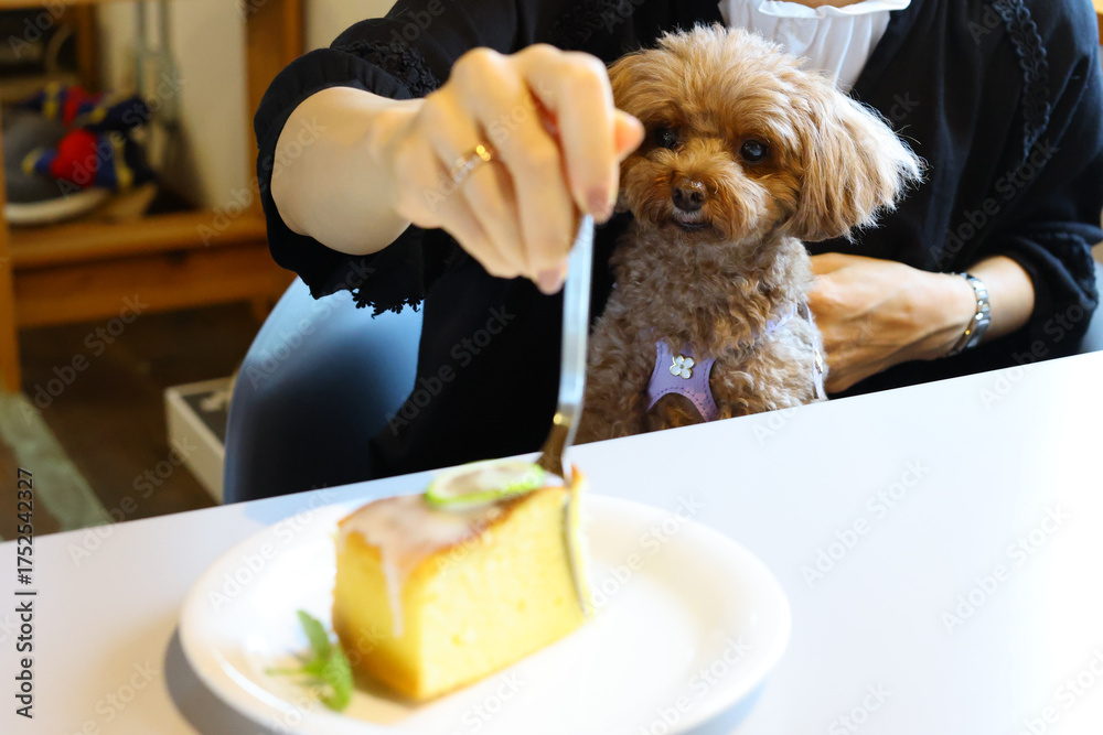 ヒト用のケーキを羨ましそうに見つめるトイ・プードル