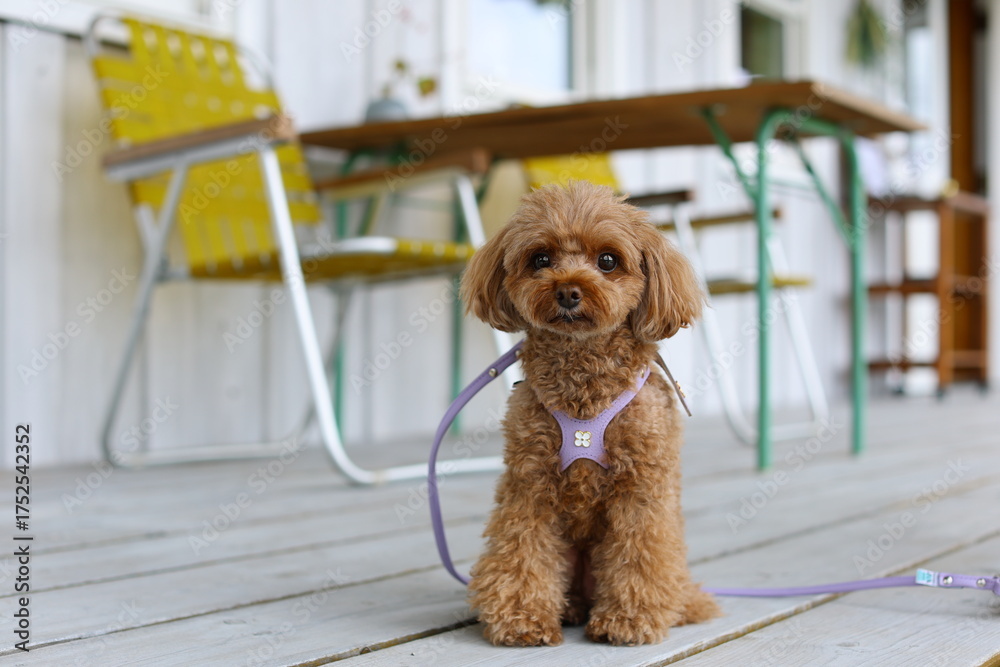 白いおしゃれな建物の前で記念撮影するトイ・プードル