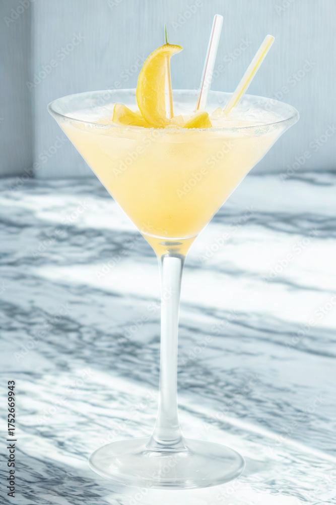 Refreshing yellow cocktail with citrus garnish in martini glass