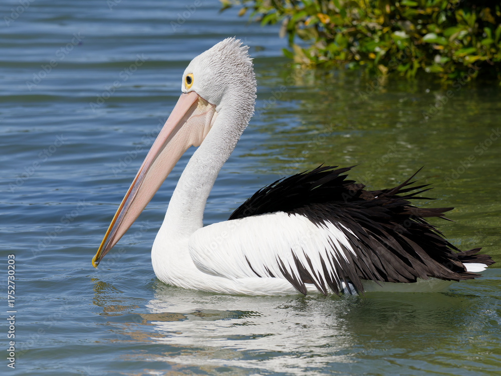 Australian Pelican (Pelecanus conspicillatus) swimming in an estuary away from camera with mangroves in background