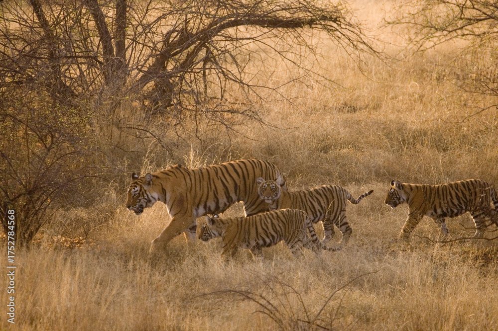 Tiger Tigress cubs dry grasslands Ranthambore National Park Rajasthan India
