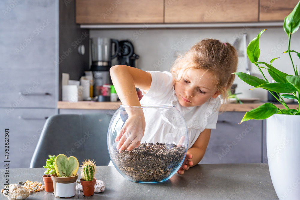 Little girl arranging soil, planting cacti and decorating a terrarium with stones and shells. Concept of creativity, eco-conscious learning and hands-on nature-based activity in childhood