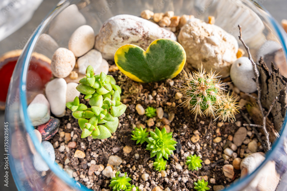 Close up top view of completed florarium with cacti, stones and decorative elements in a glass container. Concept of eco-friendly home decor, natural design and handcrafted botanical arrangement