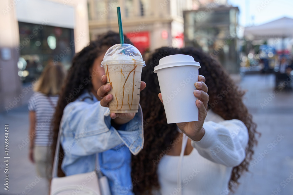 Friends holding coffee drinks in city street