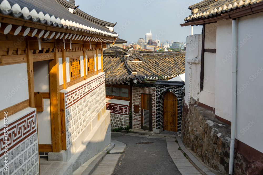 Old narrow street and traditional Korean houses of Bukchon Hanok Village in Seoul, South Korea