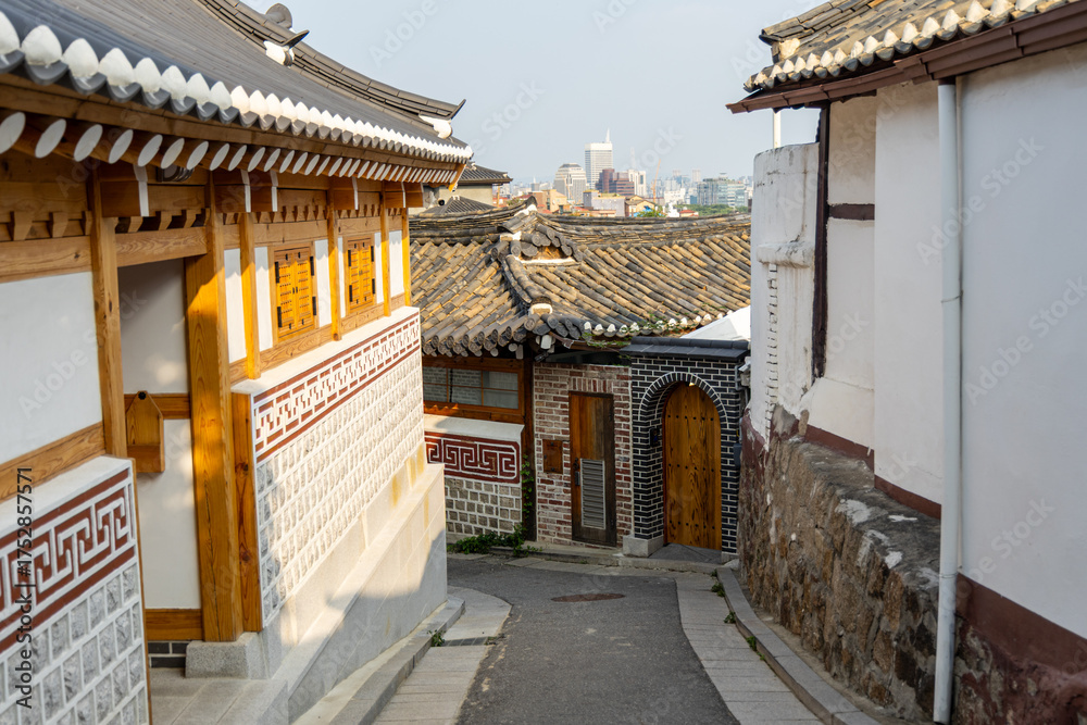 Old narrow street and traditional Korean houses of Bukchon Hanok Village in Seoul, South Korea