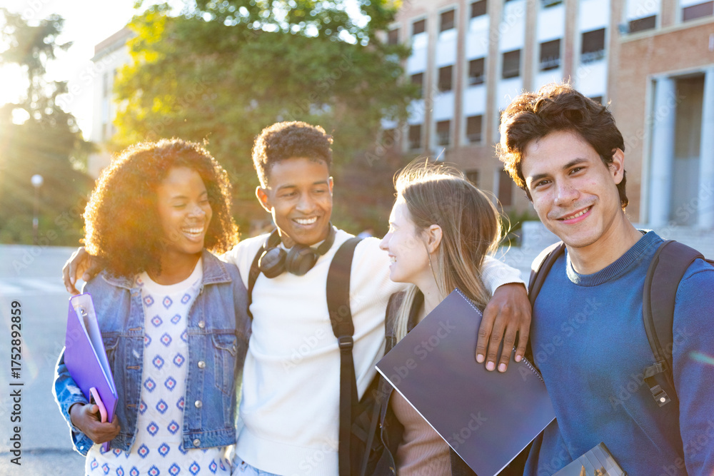 Diverse students walking together on campus during sunset