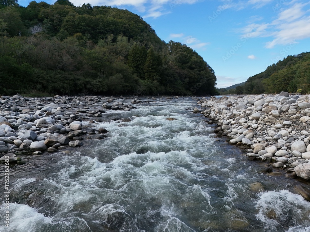 A river with a lot of rocks and trees in the background. The water is flowing and the rocks are scattered along the river
