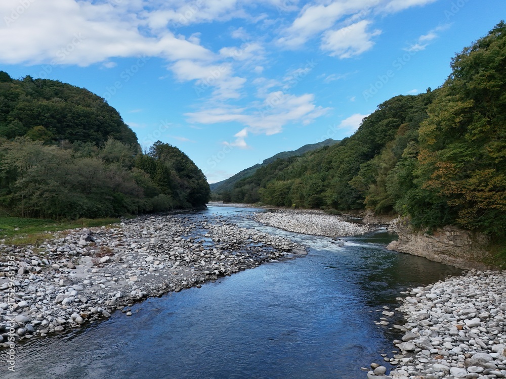 A river with a rocky shoreline and a clear blue sky in the background. The water is calm and peaceful, and the trees lining the riverbank provide a sense of tranquility