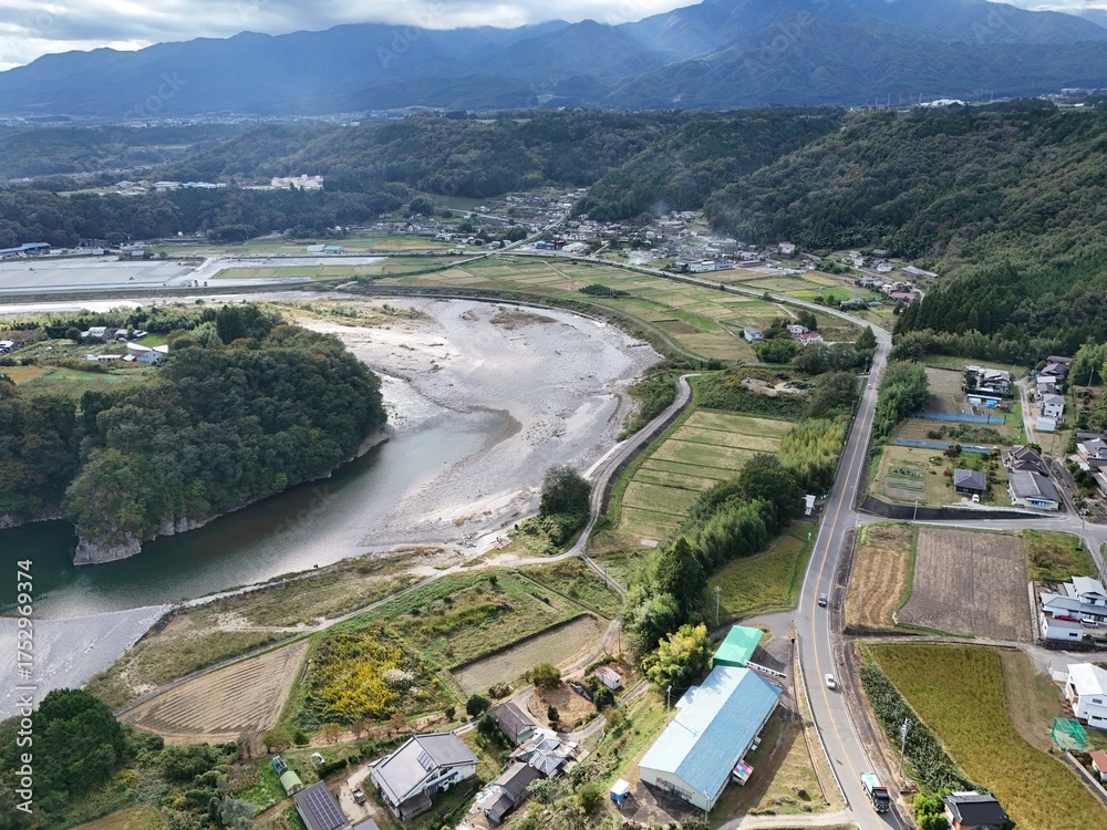 A beautiful landscape with a river and a road. The road is surrounded by houses and a few cars