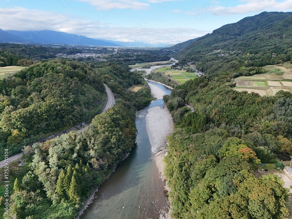 A river runs through a lush green valley with a mountain in the background. The scene is peaceful and serene, with the water flowing calmly through the valley