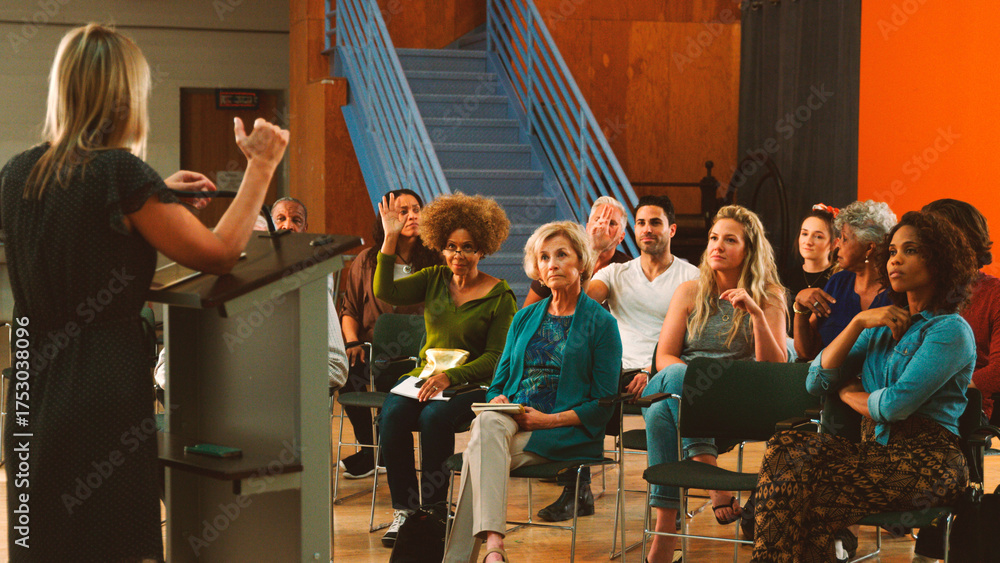 Group Attending Neighborhood Meeting In Community Center Asking Questions