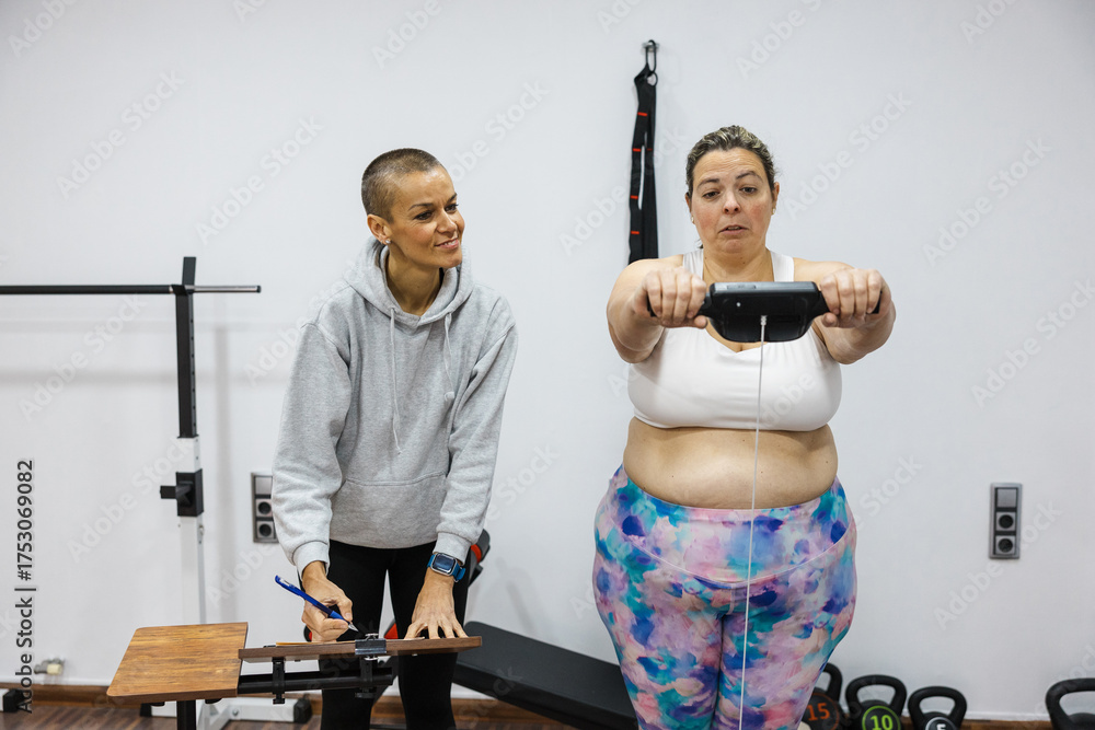 Nutritionist measuring body composition of overweight woman in gym