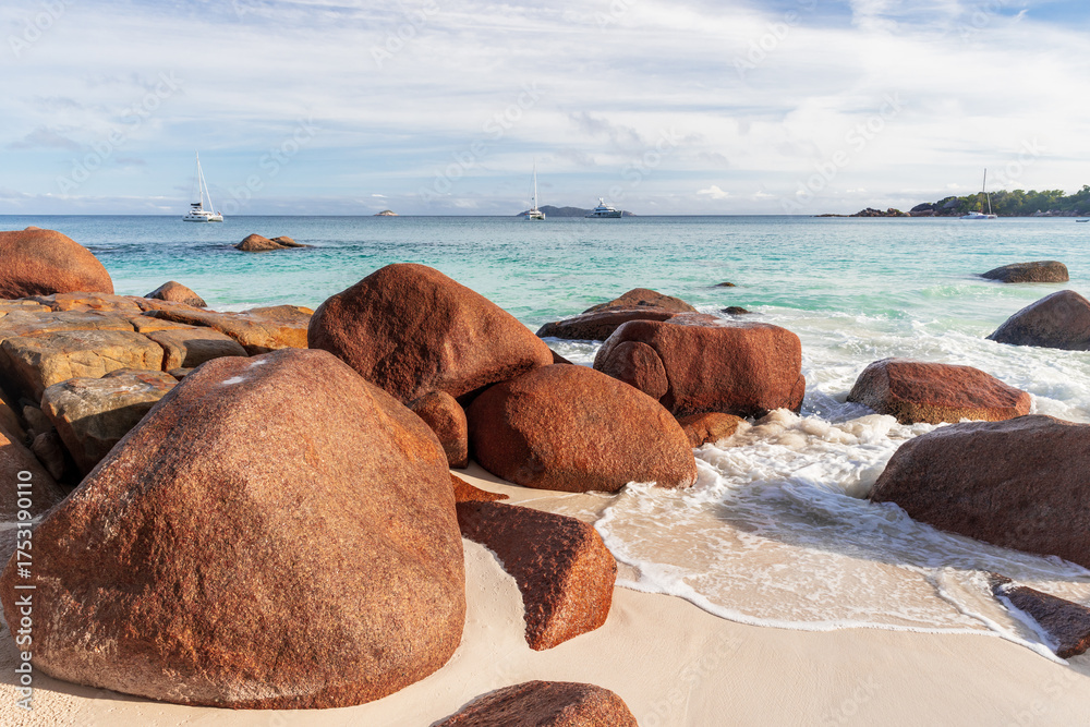 A serene coastal scene with massive red boulders along a sandy shore, Seychelles