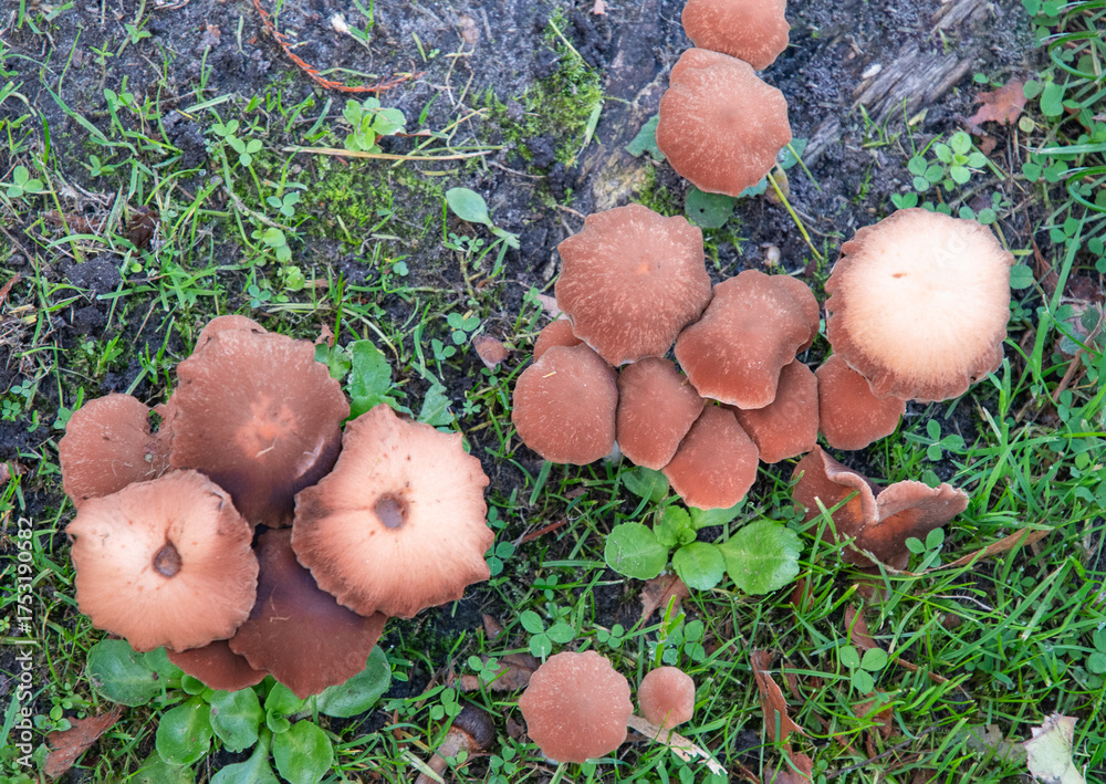 Mushrooms thriving in a natural habitat, forming small clusters on the forest floor, surrounded by vibrant green grass and dark earth, illustrating ecological themes and woodland growth