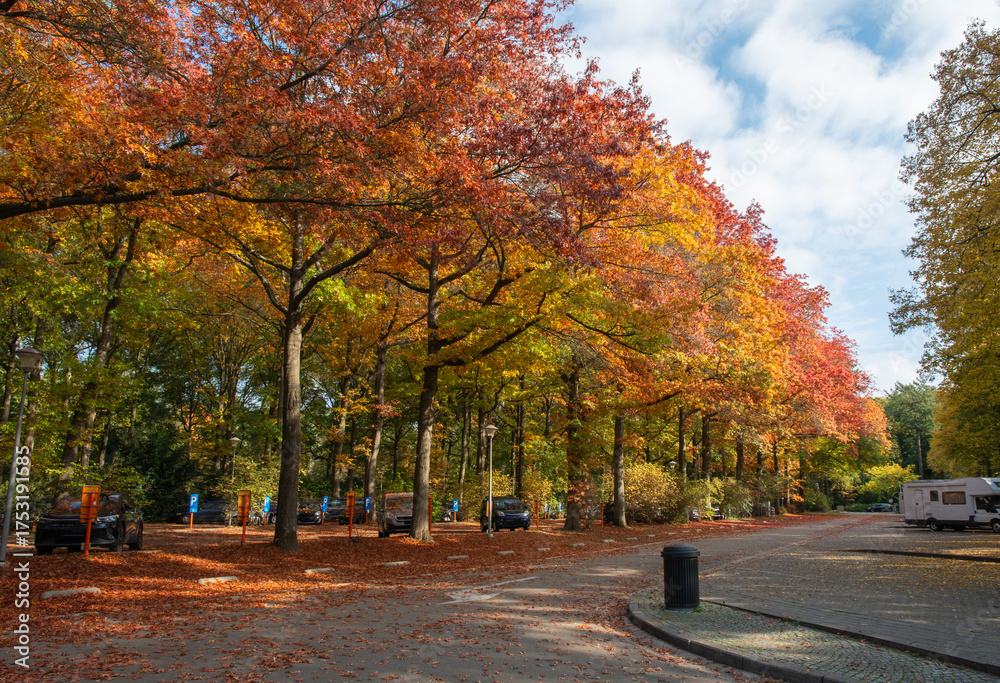 Autumn trees create a stunning display of warm orange, red and yellow leaves in a park parking lot littered with fallen leaves, under clear skies and bright daylight, Bokrijk in Belgium