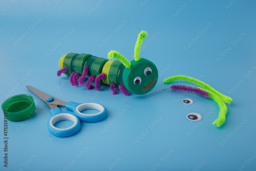 Cute caterpillar craft made from recycled bottle caps and pipe cleaners on blue background, ideal for eco-friendly brands, educational content, kids DIY activities, environmental campaigns,