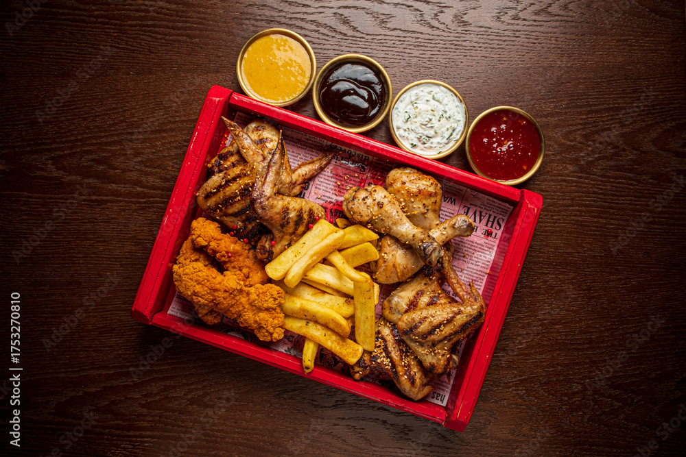A vibrant platter features grilled chicken, crispy fries, and colorful dipping sauces