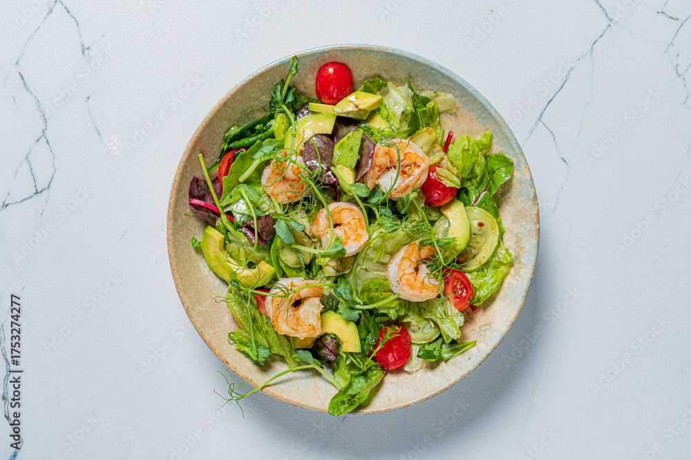A bowl filled with shrimp, mixed greens, cherry tomatoes, and avocados creates a healthy dish