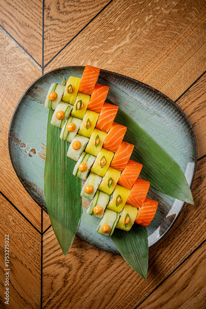 Artfully arranged sushi with salmon and assorted vegetables sits elegantly on a stylish plate