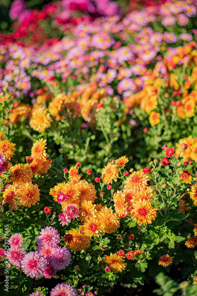 A vibrant garden blooms with colorful flowers under the bright afternoon sun
