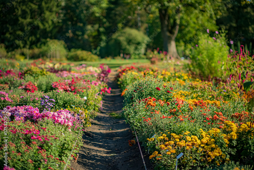 A vibrant array of flowers blooms along a sunny garden pathway, showcasing rich colors