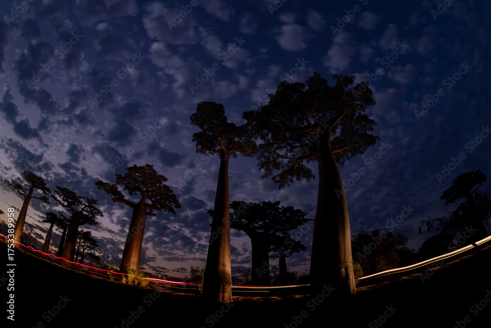 Unique perspective of the avenue of the baobabs after sunset with dramatic cloudy skies and light trails made by vehicles through it