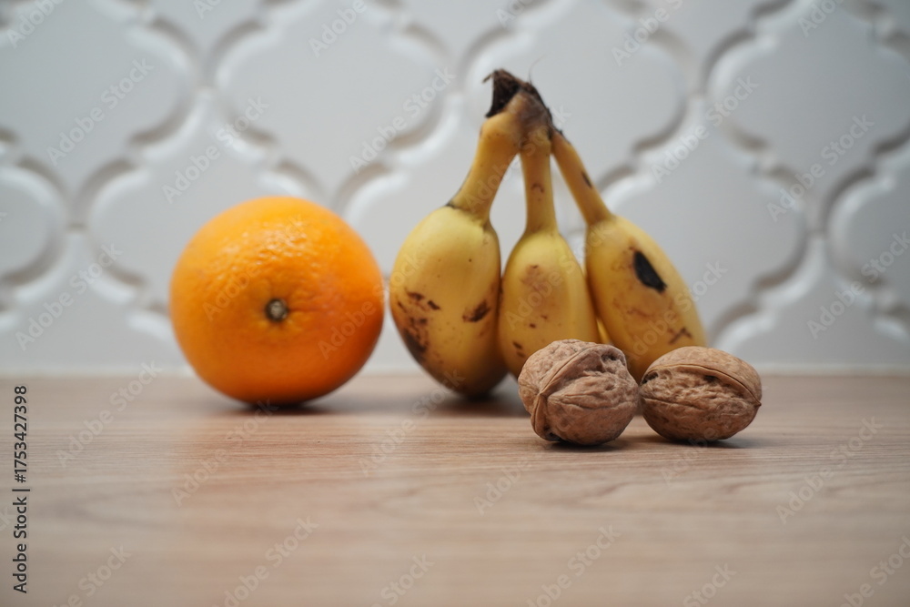A wooden table with an orange, three ripe bananas, and two walnuts against a decorative white patterned wall background
