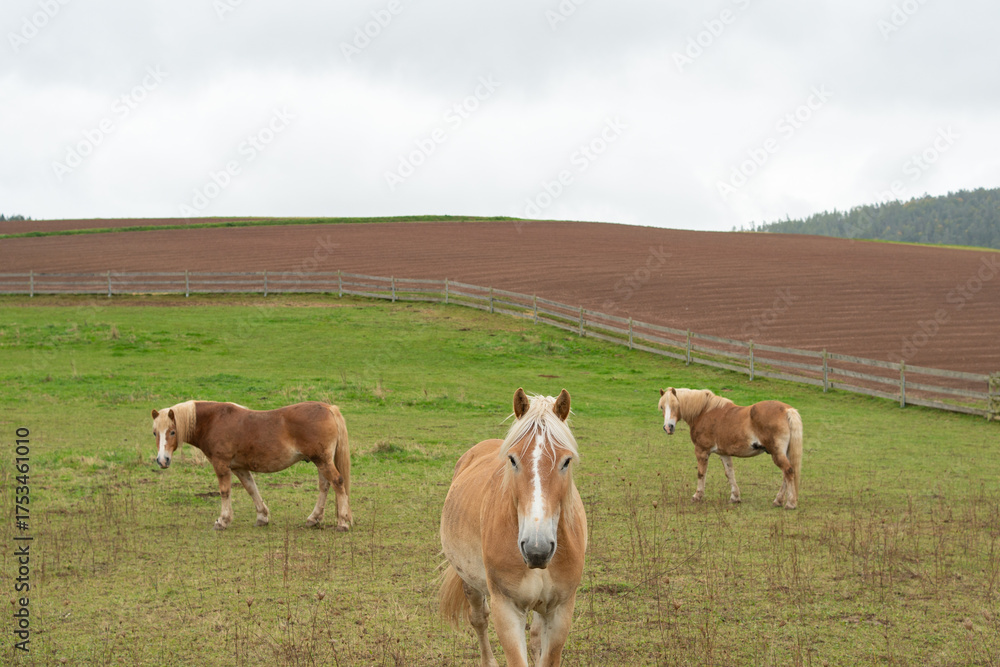 Calm farm animals feeding on pasture, rural scenery with cloudy weather and gentle rolling hills in background