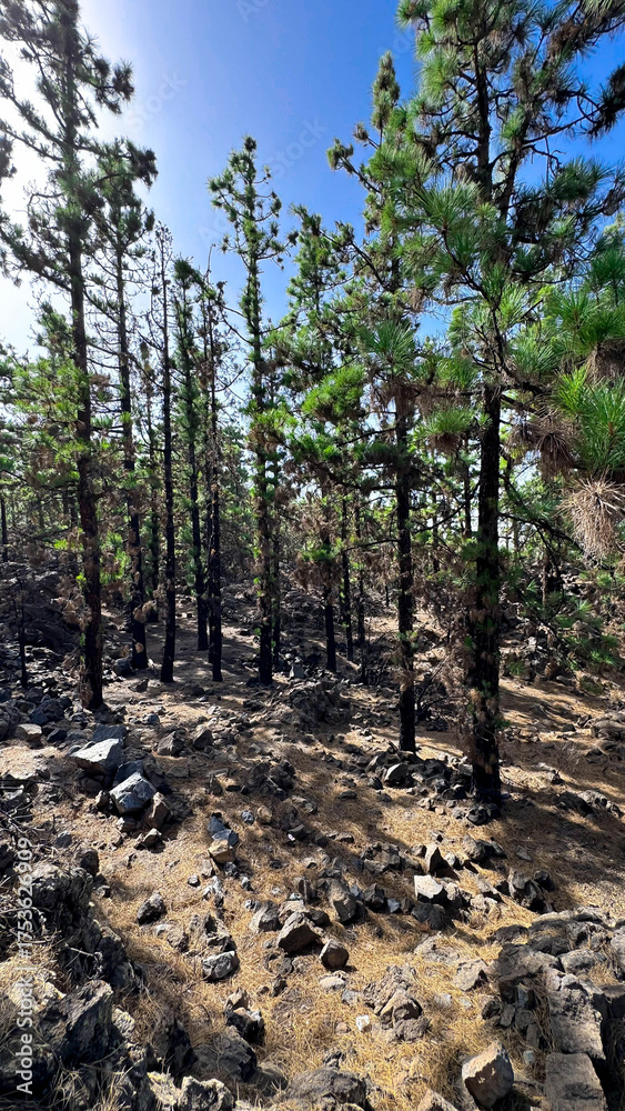 Pine forests against the blue sky. Scenic ascent to Mount Teide, Tenerife