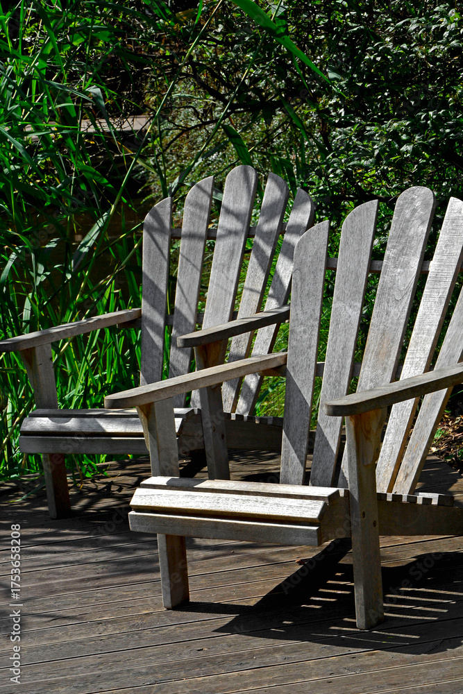 dwa drewniane fotele ogrodowe z wygodnym, szerokim oparciem, komfortowe fotele ogrodowe z drewna, two wooden chairs and in a garden, comfortable wooden garden armchair,
