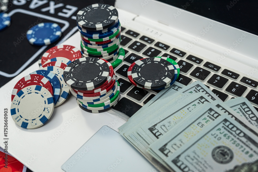 Online casino concept with poker chips, laptop and stacks of US dollars symbolizing betting and fortune