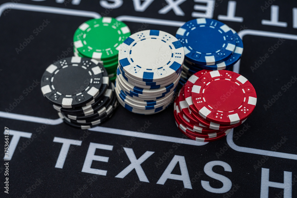 Stack of multicolored poker chips close up representing casino games, risk, gambling and betting concept