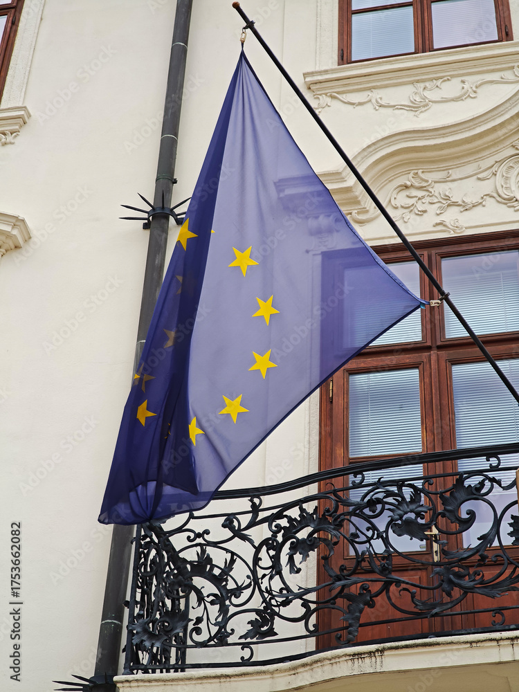 Blue EU Flag Against Cloudy Sky on a White Palace Roof with Ornate Architectural Details