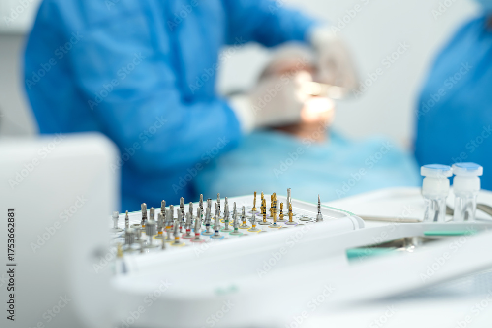 different dental equipment drills dental bur for canals in box. Treament concept