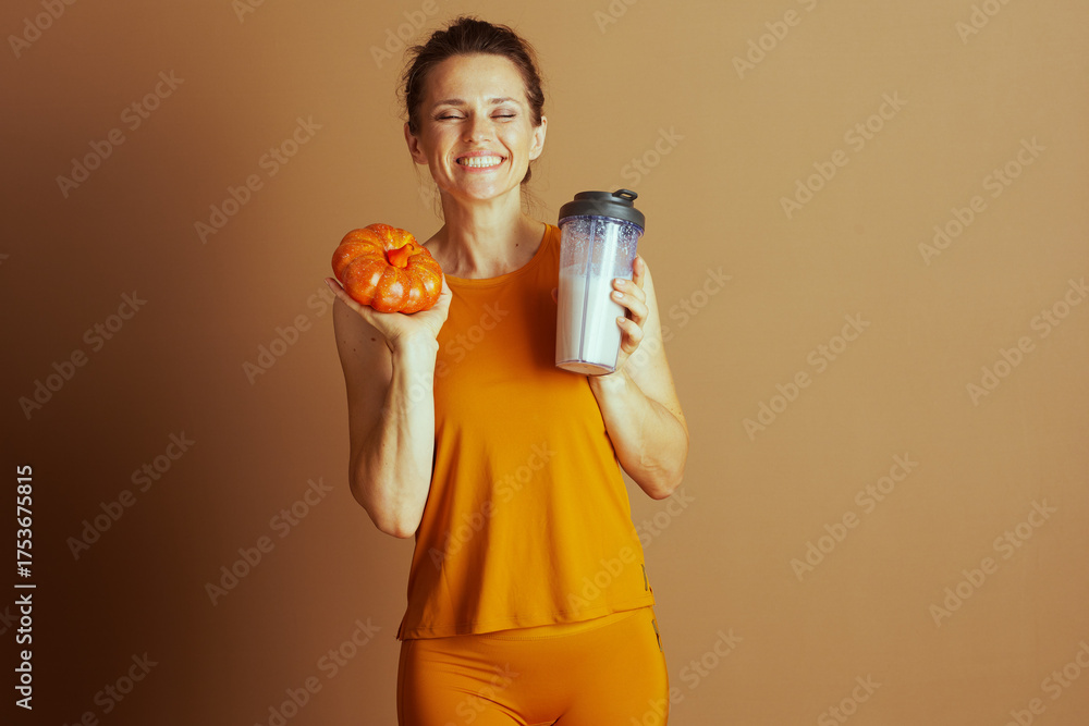 A smiling woman with closed eyes in orange activewear holds a pumpkin and a protein shaker, conveying a cheerful, healthy, autumn-themed mood.