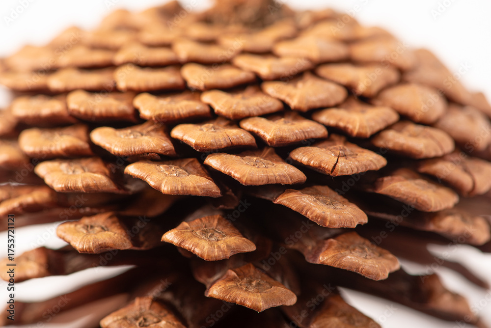 Pine cone and, detail, beautiful details of a beautiful pine cone alone placed on a white background, selective focus.
