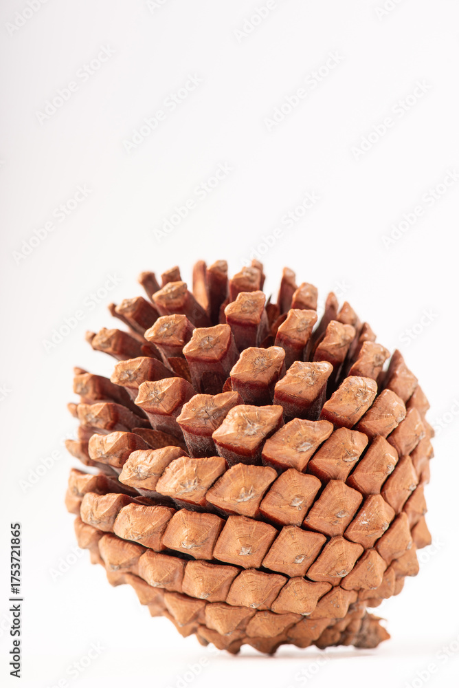 Pine cone, a beautiful pine cone alone placed on a white background, selective focus.