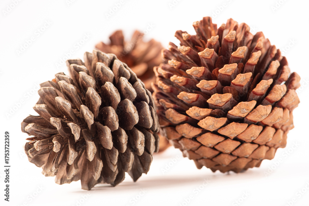 Pine cones, details of pine cones placed together on a white background, selective focus.