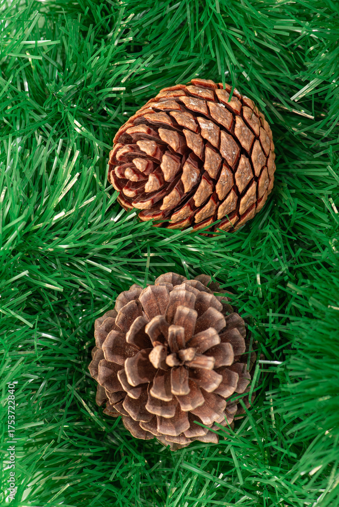 Natural pine cones and plastic leaves, details of natural pine cones placed together with plastic leaves on a white background, selective focus.