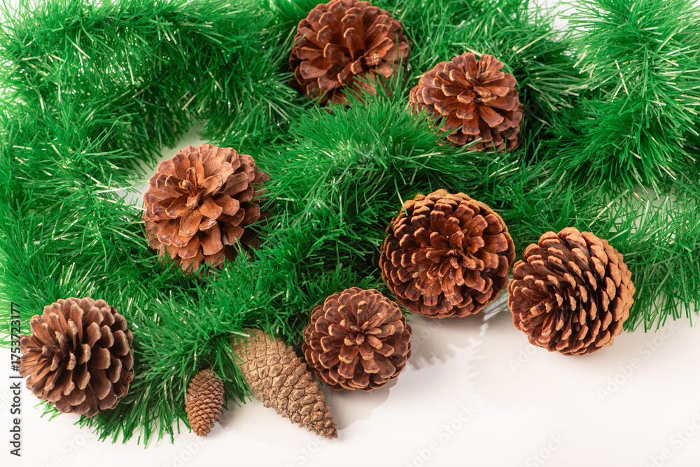 Natural pine cones and plastic leaves, details of natural pine cones placed together with plastic leaves on a white background, selective focus.